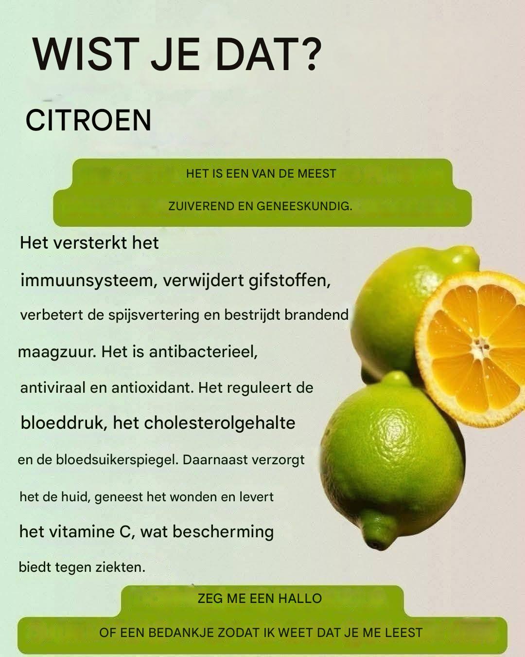 De citroen is een van ‘s werelds bekendste vruchten, niet alleen vanwege zijn pittige en verfrissende smaak, maar ook vanwege zijn vele geneeskrachtige en culinaire eigenschappen. Al sinds de oudheid gebruikt in de keuken en de natuurlijke geneeskunde, blijft het een waardevolle bondgenoot voor gezondheid en welzijn.