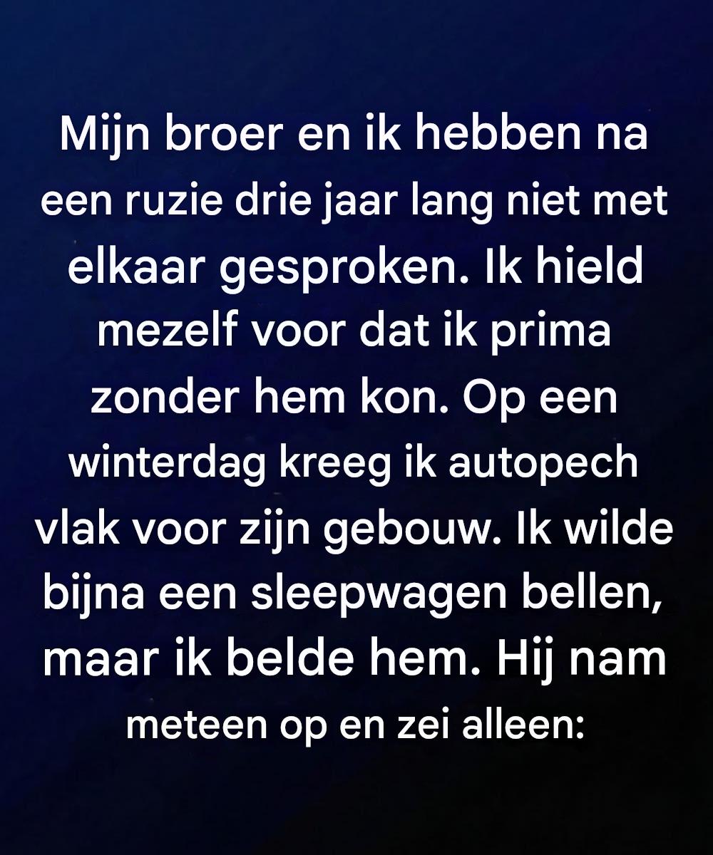 Ik pakte mijn telefoon om de wegenwacht te bellen. Dat was de verstandige keuze. Maar terwijl ik scrolde, bleef mijn vinger hangen bij een naam die ik nooit had verwijderd. Ik staarde er langer naar dan de bedoeling was. Allerlei excuses kwamen tegelijk op. Laat hem met rust. Heropen de zaak niet. Los het zelf op.