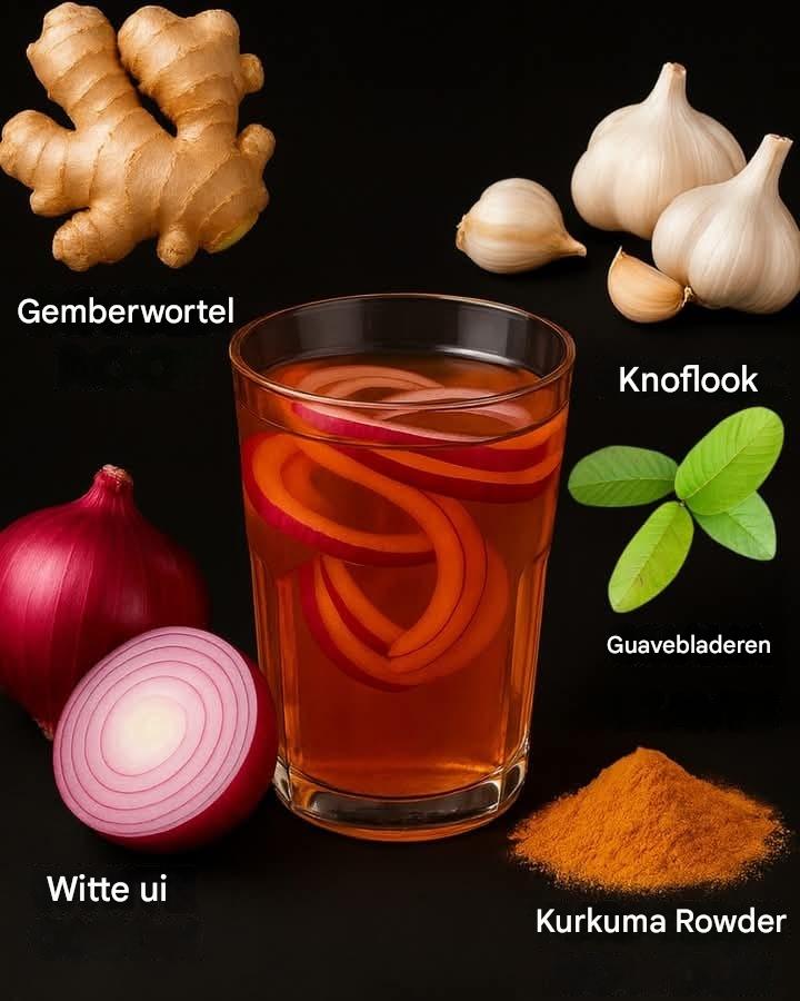 Elk ingrediënt in deze thee is een superster, maar samen zijn ze onstuitbaar. Knoflook, kurkuma, ui, gember, kaneel en guaveblad zijn niet zomaar basisproducten in je voorraadkast – ze zijn een ware apotheek van de natuur, boordevol genezende, beschermende en energiegevende stoffen. Stel je een brouwsel voor dat een opgeblazen gevoel aanpakt, je immuunsysteem versterkt en zelfs je humeur verbetert, en dat alles smaakt als troost in een kopje.