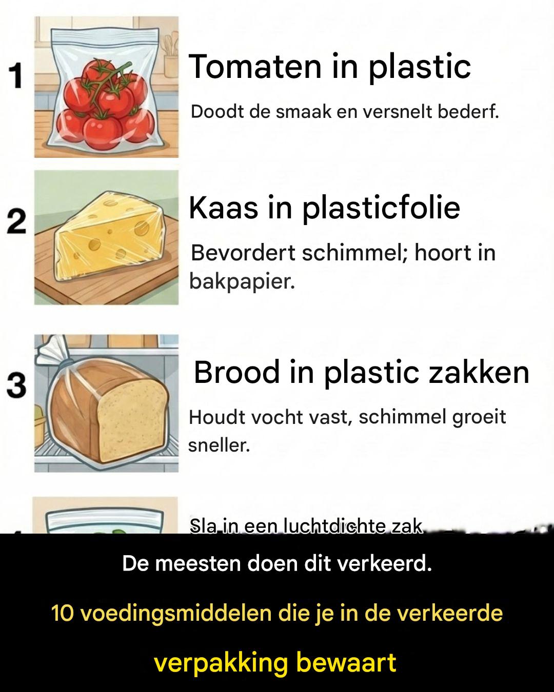 Het zou een afbeelding of tekst kunnen zijn met de tekst ‘1 Tomaten in plastic: Doodt de smaak en versnelt het bederf. 2 Kaas in plasticfolie: Bevordert schimmelvorming; hoort in bakpapier. 4 Brood: Houdt vocht vast, waardoor schimmel sneller groeit. De meeste mensen doen dit verkeerd. 10 voedingsmiddelen die je in de verkeerde verpakking bewaart’ Het vers en smaakvol houden van voedsel draait niet alleen om het kopen van kwaliteitsingrediënten, maar ook om de manier waarop je het bewaart . Het gebruik van de verkeerde verpakking of omgeving kan leiden tot bederf, smaakverlies en zelfs verlies van voedingsstoffen . Veel mensen maken onbewust fouten bij het bewaren van alledaagse voedingsmiddelen.
