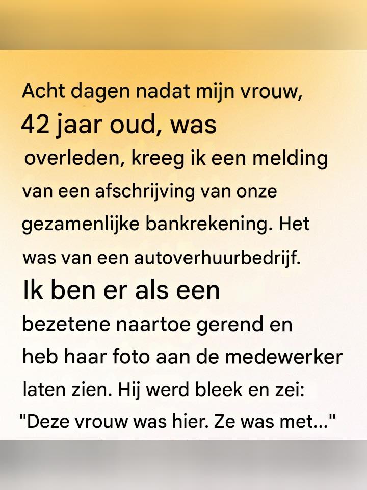 Er waren acht dagen verstreken sinds de begrafenis. Acht dagen waarin ik ontdekte dat stilte niet leeg is – dat ze drukkend is, dat ze ruimtes vult, dat ze in je oren zoemt wanneer de wereld niet meer vraagt hoe het met je gaat. Ik was net begonnen te leren ademen in die stilte toen ik het zag.