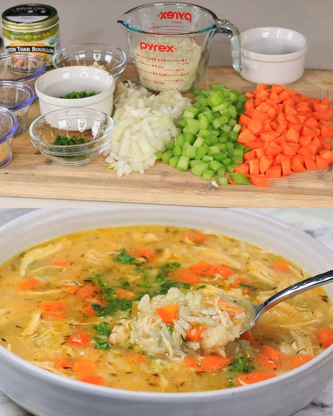 Deze zelfgemaakte kippen- en rijstsoep is het perfecte troostgerecht voor elk moment van het jaar. Hij is ongelooflijk smaakvol, makkelijk te maken en kan zowel op het fornuis als in een slowcooker worden bereid. Boordevol malse kip, verse groenten en aromatische kruiden is deze soep niet alleen heerlijk, maar ook voedzaam. Of je nu op zoek bent naar een verwarmende maaltijd op een koude dag of een voedzaam gerecht wanneer je je niet lekker voelt, deze kippen- en rijstsoep zal zeker een favoriet van het hele gezin worden.
