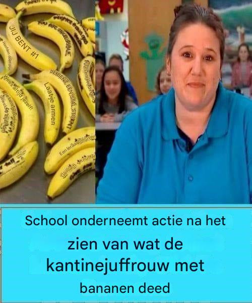 Een medewerkster van de schoolkantine schrijft dagelijks motiverende berichten op bananen, wat leerlingen opvrolijkt. Haar verhaal ging viraal en verspreidde positiviteit.