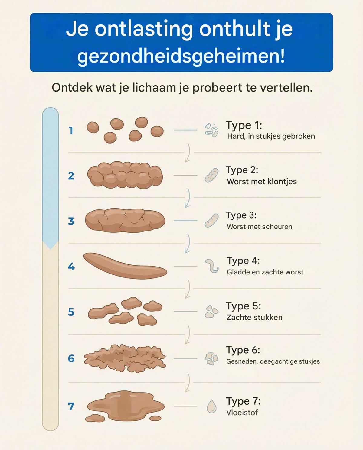 De kleur, consistentie, grootte en geur van uw ontlasting geven allemaal veelzeggende informatie over uw gezondheid. Om u te leren waar u op moet letten bij het onderzoeken van uw ontlasting, gebruiken we de Bristol Stool Scale. Deze schaal is ontwikkeld door onderzoekers van het Bristol Royal Hospital in het Verenigd Koninkrijk. De schaal helpt ons verschillende soorten ontlasting te classificeren en uit te leggen wat elk type betekent.