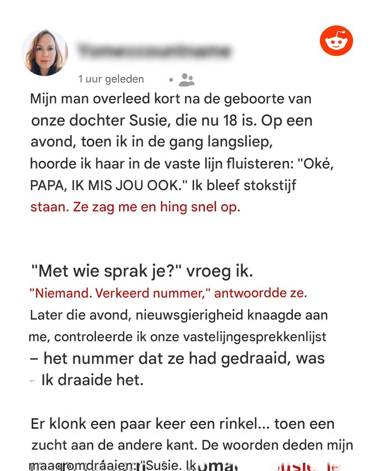 Ik hoorde mijn dochter fluisteren « Ik mis je, papa » aan de telefoon – ik heb haar vader 18 jaar geleden begraven