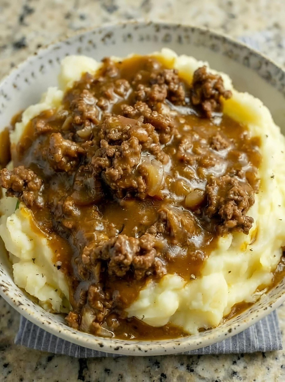 Geniet van een heerlijk en troostend gerecht met dit snelle en eenvoudige recept voor “Rundergehakt met jus over aardappelpuree”. Met rundergehakt, ui, knoflook, runderbouillon en Worcestershire-saus is het in slechts 45 minuten klaar voor een smakelijk doordeweeks diner!