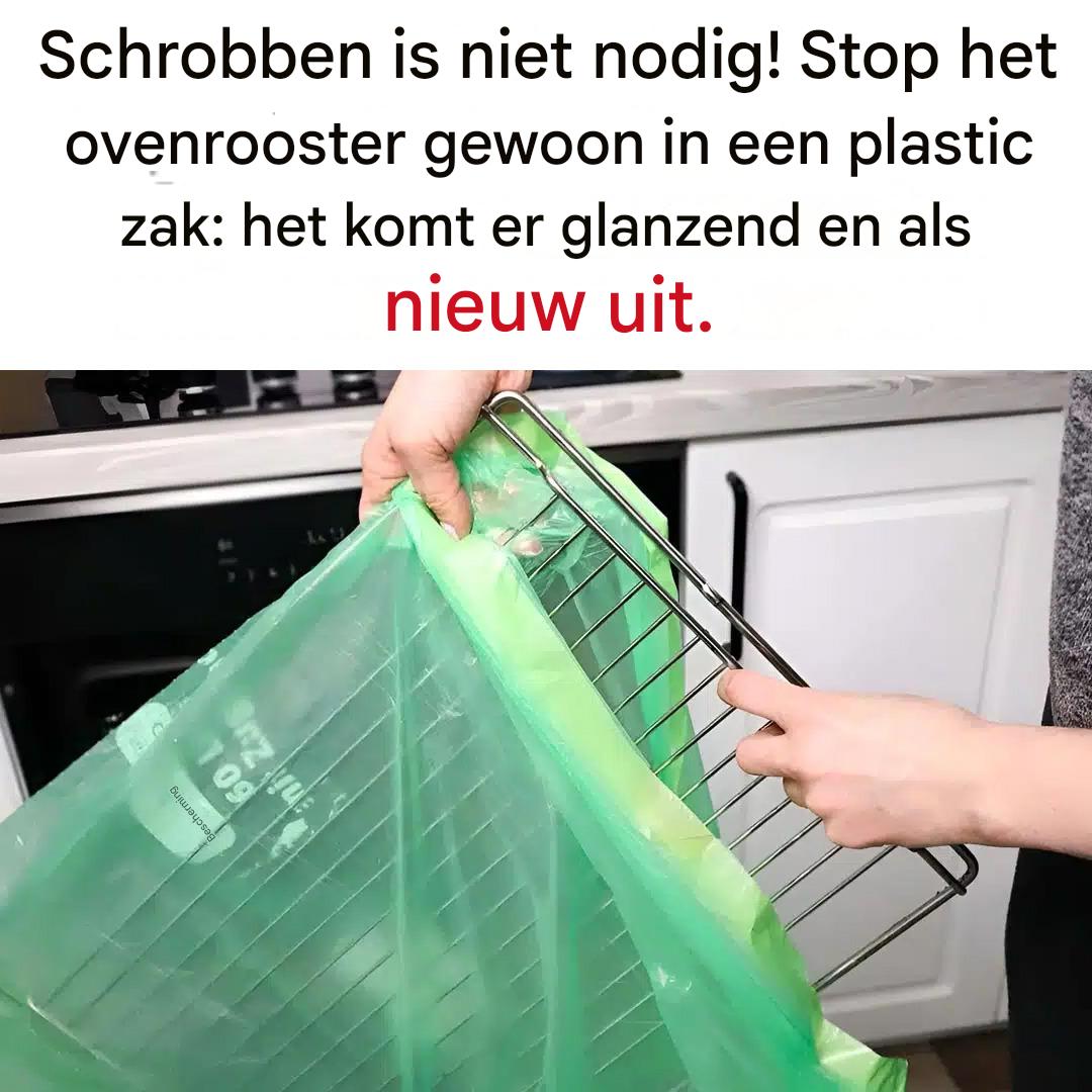 Schrobben is niet nodig! Plaats het ovenrooster gewoon in een plastic zak: het komt er vlekkeloos en als nieuw uit.