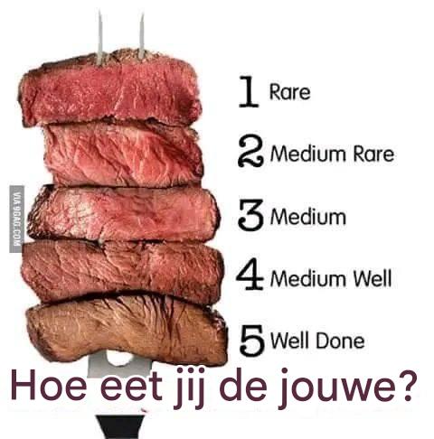 Medium-rare 130-135°F PERFECTIE.  Het vet is volledig gesmolten, romig en goed vermengd. De steak is sappig, mals en smelt in je mond.