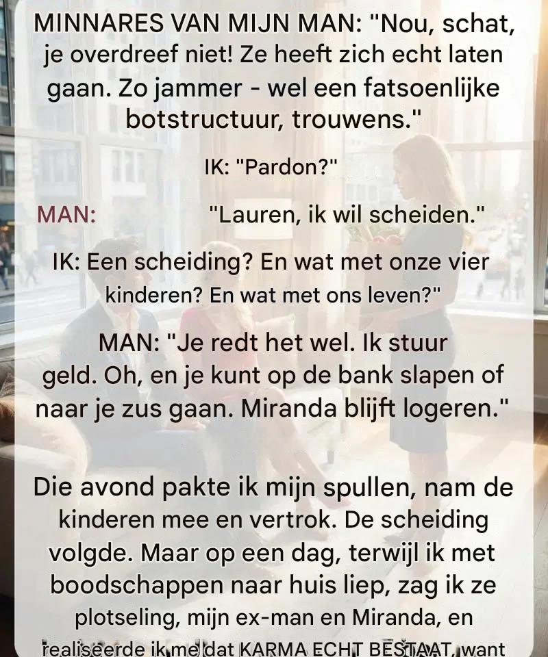 Die avond pakte ik, in plaats van te smeken of te ruzieën, mijn spullen in. Ik verzamelde de kinderen, sloot de deur van een huis dat ik meer dan tien jaar had gekoesterd, en stapte het onbekende tegemoet. Het huwelijk liep kort daarna op de klippen, met angst, verdriet en verwarring als gevolg, maar ook een stille helderheid die met de tijd sterker werd.