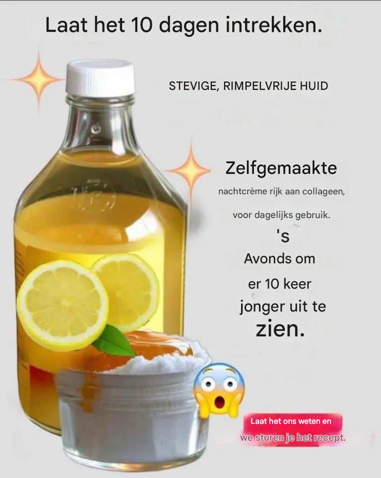 Deze nachtcrème, rijk aan essentiële voedingsstoffen, bestaat voornamelijk uit pure honing, bakpoeder en vers citroensap. Deze unieke combinatie van ingrediënten werkt synergetisch samen om uw huid te voeden, te exfoliëren en te regenereren terwijl u slaapt. Regelmatig gebruik zorgt ervoor dat u op natuurlijke wijze en tegen lagere kosten een gladdere, stralendere en jonger uitziende huid krijgt.